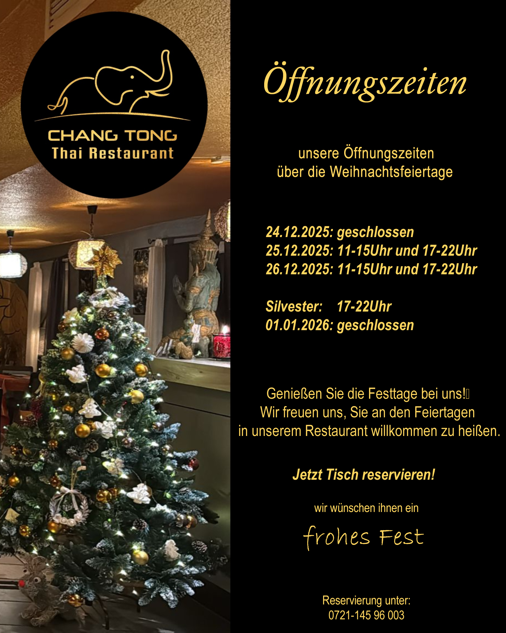 wir möchten Sie hiermit im Thai- Restaurant „Chang-Tong“ begrüßen, was „Goldener Elefant“ bedeutet. Erlauben Sie uns, Ihnen eine kleine Einführung in die thailändische Küche zu geben. In Thailand isst man verschiedenes zur gleichen Zeit mit Löffel und Gabel, ganz selten, bzw. nur zu speziellen Gerichten nimmt man auch Stäbchen. Sie werden feststellen, dass Essen für die Thailänder einiges mehr bedeutet als nur bloße Nahrungsaufnahme. Auch sollte es Ihnen nicht entgehen mit welcher Sorgfalt die Speisen zubereitet, zusammengestellt und dargeboten werden. Was Sie erwartet ist eine äußerst kunstvolle Komposition thailändischer Esskultur. Es stehen nicht nur Fisch, Fleisch, Gemüse und Obst bereit, sondern alles wird auch noch in verschiedenen Arten der Zubereitung angeboten. Gegenüber einem scharfen Gericht steht ein mildes, ein süß-saures wird mit einem scharf-säuerlichen ausgeglichen, ein gebratenes oder gegrilltes mit einem gedämpften, eine flüssige Speise mit einer festen knusprigen, die zum Kauen anregt. All ddiese Leckerbissen sind nach thailändischer Auffassung nur eine Beigabe für den Mittelpunkt der Mahlzeit – den REIS.